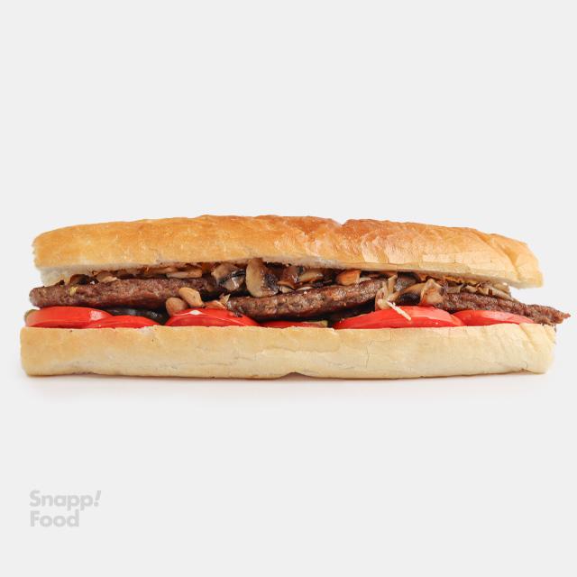یک عدد برگر گوشت گوساله دست ساز 120 گرمی، ژامبون میکس گوشت و مرغ 70%، قارچ، پنیر پیتزا، کاهو، گوجه، خیارشور، نان باگت، به همراه سس به انتخاب شما