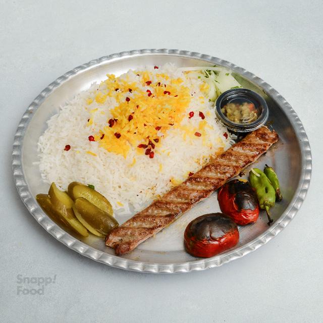 یک سیخ کباب کوبیده مخلوط گوشت گوسفندی و گوساله ۱۱۰ گرمی، ۴۰۰ گرم برنج . دورچین : گوجه و فلفل کبابی ، لیموترش یا نارنج ، خیارشور ، کلم قرمز
