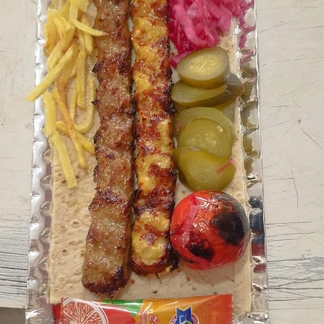 یک سیخ کباب کوبیده مخلوط گوشت گوساله و گوسفندی 100 گرمی، دورچین: گوجه، کلم، آبلیمو یا نارنج