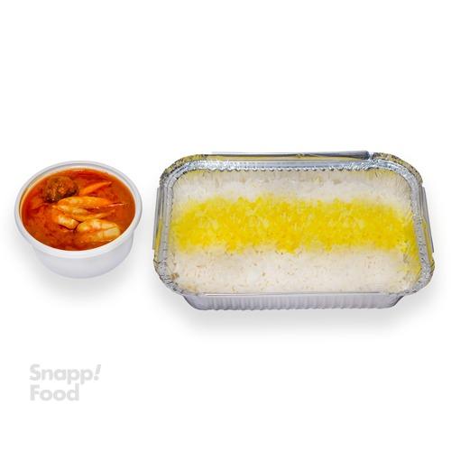 300 گرم خورشت قیمه با سیب زمینی یا بادمجان، 60گرم گوشت گوساله، 400گرم برنج ایرانی