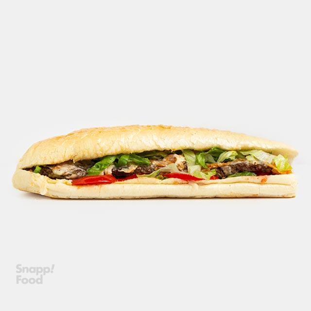 یک عدد برگر مخلوط گوشت گوساله و گوسفندی 130 گرمی دست ساز، یک اسلایس ژامبون گوشت یا مرغ، قارچ، پنیر پیتزا، کاهو، گوجه، خیارشور، نان باگت