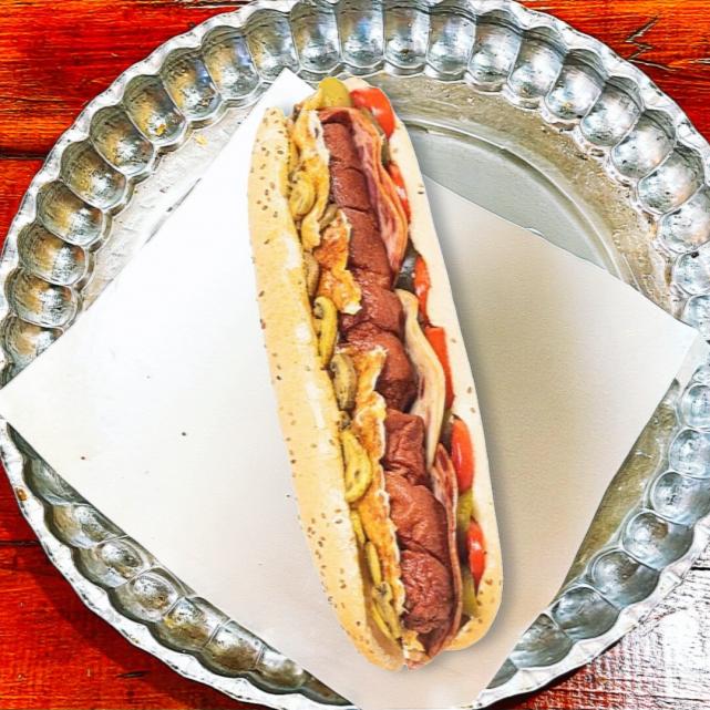 یک عدد سوسیس هات داگ گوشت 70%، 2 ورق ژامبون گوشت 70%، کاهو، گوجه، خیارشور، نان باگت، سس کچاپ