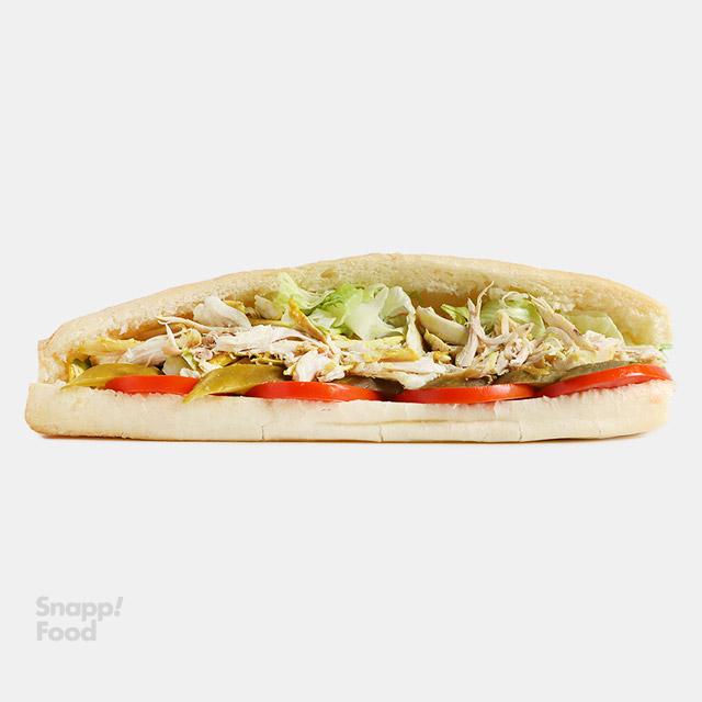 120 گرم ژامبون مرغ 70%، کاهو، گوجه، خیارشور، نان باگت