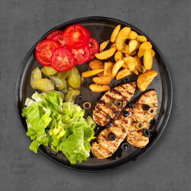 فیله مرغ گریل هیزمی، دورچین: کاهو، گوجه فرنگی، زیتون، خیارشور، سیب زمینی سرخ کرده