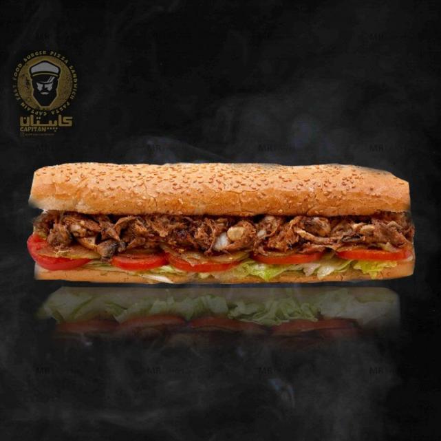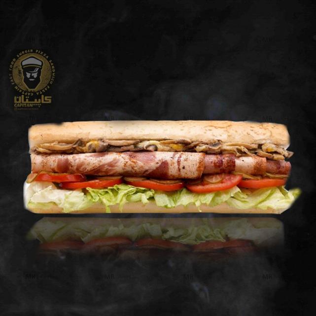 ژامبون مرغ 90%، پنیر، قارچ، خیارشور، گوجه، کاهو، سس مخصوص، نان باگت سحر