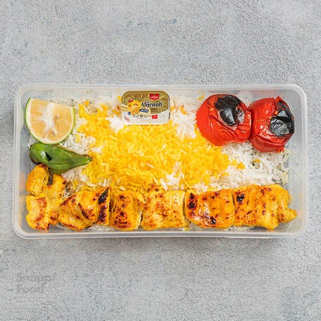 یک سیخ جوجه کباب ران مرغ زعفرانی ۲۰۰ گرمی، 400 گرم برنج ایرانی، نثار زعفرانی، دورچین: گوجه کبابی، فلفل کبابی، لیموترش تازه، نان تافتون، پیاز