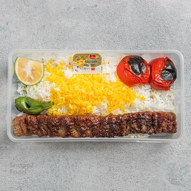 یک سیخ کباب لقمه مخلوط گوشت گوساله و گوسفندی 200 گرمی، 350 گرم برنج ایرانی، دورچین: گوجه کبابی، فلفل کبابی، لیمو ترش تازه، سماق