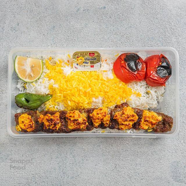 کباب کوبیده مخلوط گوشت گوسفندی و گوساله 100 گرمی 400 گرم برنج ایرانی، دورچین: گوجه کبابی، فلفل کبابی، لیموترش تازه، سماق، پیاز، نان تافتون