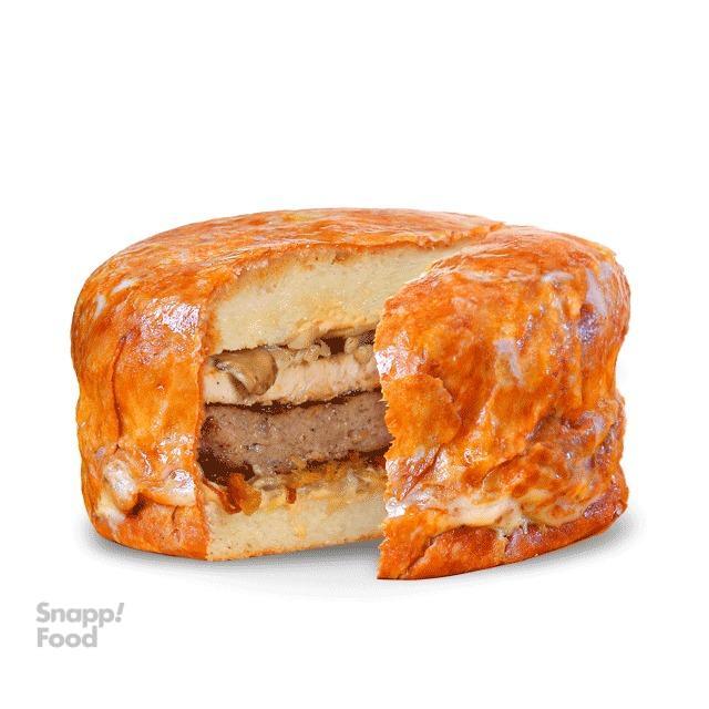 ۲۸۰ گرم برگر گوشت گوساله کبابی دست ساز، پنیر پیتزا، قارچ، سس مخصوص، پیاز داغ، نان گرد مک ، بدون دورچین