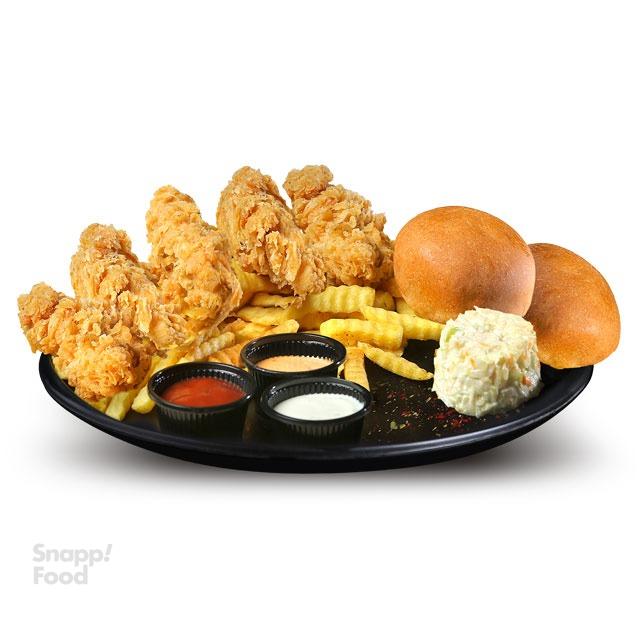 5تکه فیله مرغ سوخاری، به همراه سیب زمینی سرخ شده، یک عدد سالاد کلم، سس سیر، یک عدد نان بروتچن