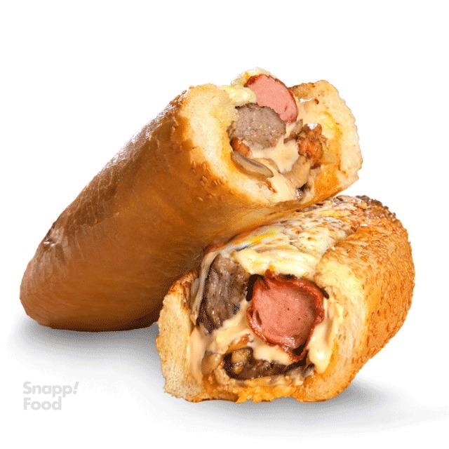 140 گرم برگر گوشت گوساله کبابی دست ساز ، یک عدد سوسیس هات داگ80% ، چیپس، سس قارچ، پنیر، نان باگت فرانسوی، بدون دورچین