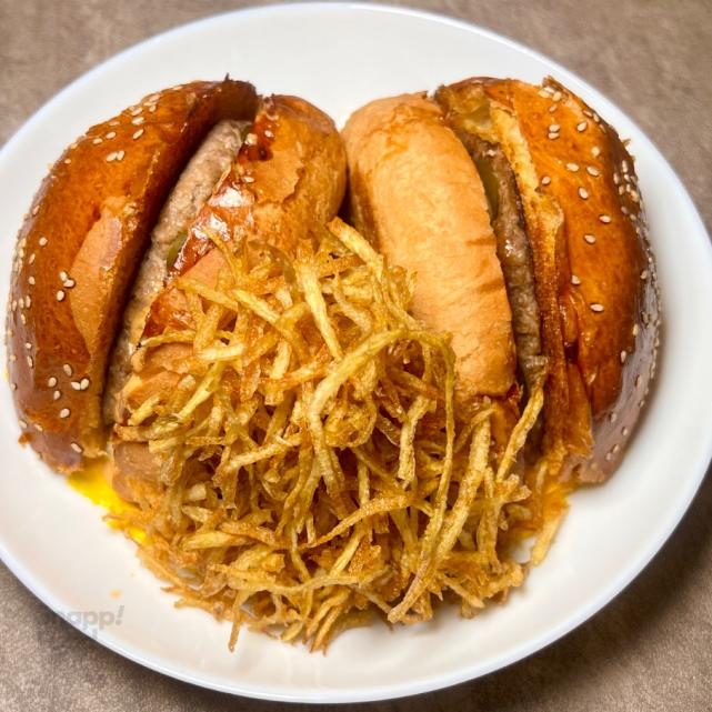 یک عدد برگر دست ساز گوشت گوساله 150 گرمی، سوجوک 90% (سوسیس خشک ترکیه ای)، پیاز کاراملی، پنیر گودا، کاهو، گوجه فرنگی، خیارشور، سس مخصوص، نان گرد برگر، سس یک نفره
