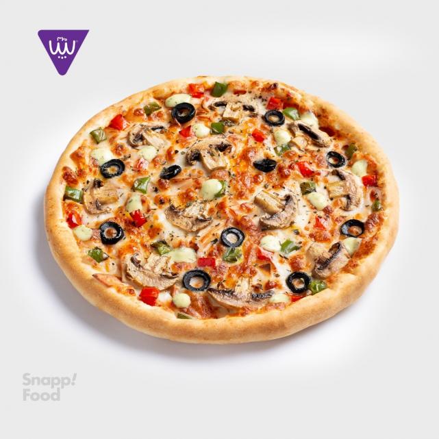 خمیر نازک ایتالیایی، قارچ، ذرت، گوجه فرنگی، زیتون، فلفل دلمهای، سس مخصوص، پنیر پیتزای مخصوص، سس بیانز، ادویه مخصوص پیتزا