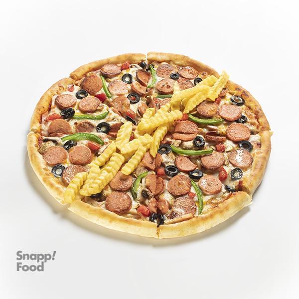ژامبون مرغ دودی، پپرونی، قارچ طعم دار شده، سس مخصوص، پنیر مخصوص، سیب زمینی سرخ شده