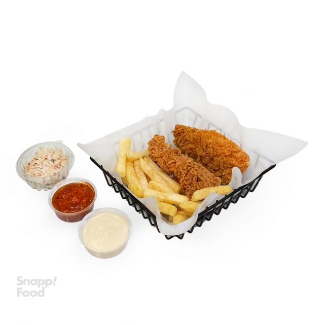 دو تکه فیله مرغ سوخاری+سس مخصوص+سیب زمینی سرخ شده+ سالاد کلم