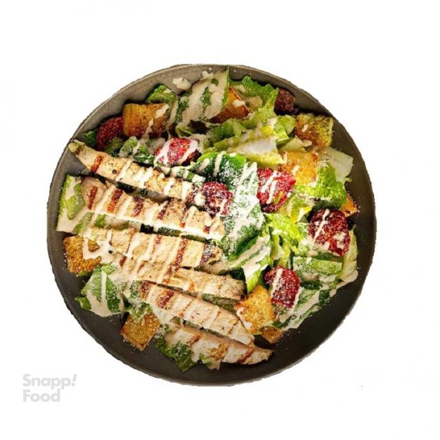 2 تکه فیله مرغ گریل شده، کاهو، گوجه گیلاسی ، پنیر پارمسان، نان سیر، سس سزار