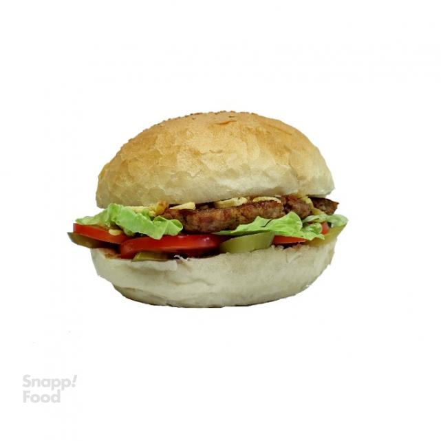 یک عدد برگر ذغالی دست ساز مخلوط گوشت گوساله و گوسفندی 170 گرمی طعم دار شده، سس مخصوص دست ساز، کاهو، گوجه، خیارشور، نان مک کنجدی تست شده