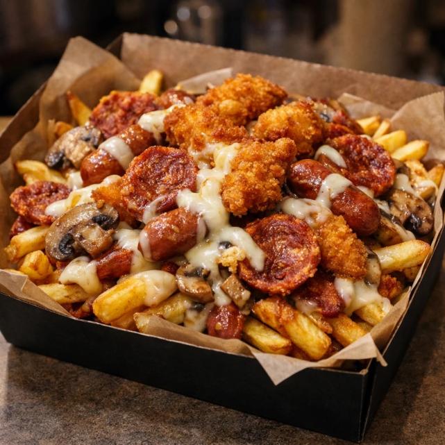 ۲۰۰گرم سیب زمینی سرخ شده،ترکیب قارچ و پنیر موزارلا، شش عدد سوسیس انگشتی ۸۰درصد گوشت،سس مخصوص و سس سیر