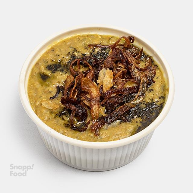 یک پرس، بلغور جو، سبزی، گوشت گوسفندی ریش ریش شده، نخود، لوبیا قرمز، عدس، پیاز داغ