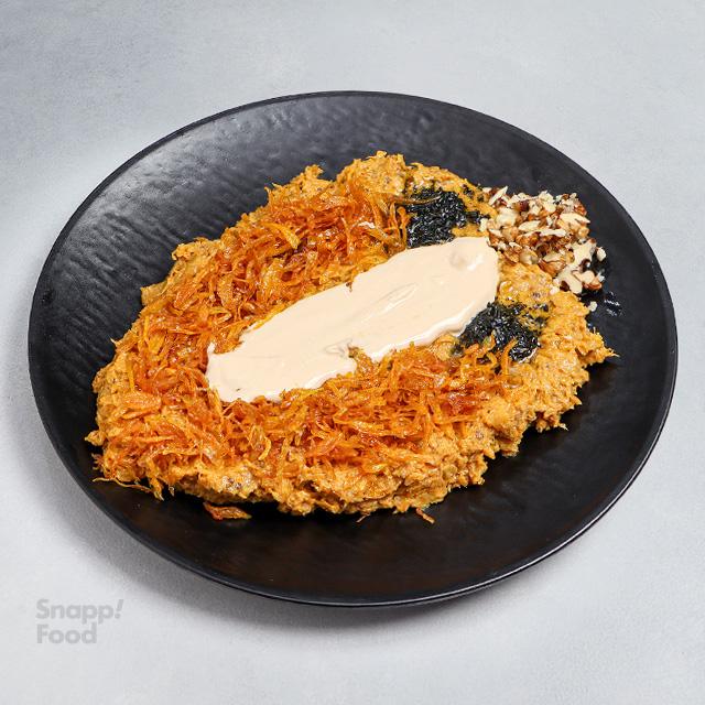 500گرم ته چین زعفرانی با برنج اعلا 30گرم زرشک 130گرم مرغ ریش ریش شده طعم دار، همراه با سس مرغ