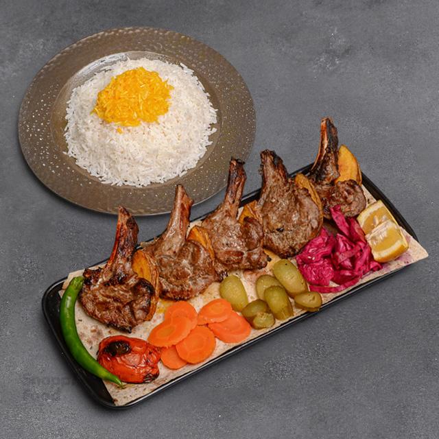 یک سیخ بره کباب گوشت گوسفندی 200 گرمی، 350 گرم برنج ایرانی، دورچین فصل