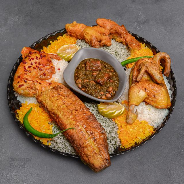 450 گرم مرغ اکبر جوجه نصف مرغ سرخ شده، 350 گرم چلوی ایرانی، دورچین روز