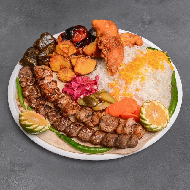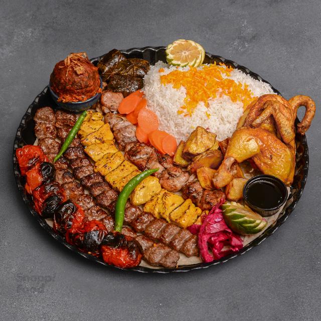 یک سیخ کوبیده گوسفندی ۲۰۰ گرمی یک سیخ جوجه زعفرانی ۳۰۰ گرمی (سینه) ۲ پرس برنج ایرانی ساده ۳۵۰ گرمی ران مرغ سس پز ۳۵۰ گرمی ۳ عدد دلمه برگ مو ۴۰ گرمی