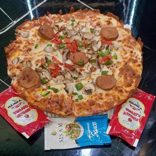 خمیر پیتزا آمریکایی، میکس کالباس اسلایس، پنیر پیتزای میکس، قارچ، فلفل دلمه و گوجه اسلایس، سس کچاپ و مایونز