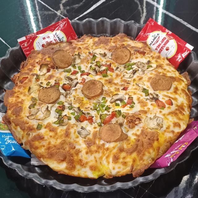 خمیر پیتزا آمریکایی، کالباس پیرونی ۹۰درصد، پنیر پیتزا میکس، قارچ، فلفل دلمه ای وگوجه، سس یک نفره کچاپ و مایونز