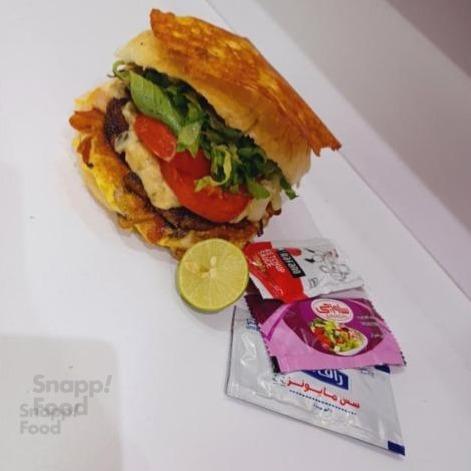 یک عدد همبرگر 30% شرکتی، یک عدد کتلت دست ساز 120 گرمی، سس مخصوص، گوجه، کاهو، نان گرد