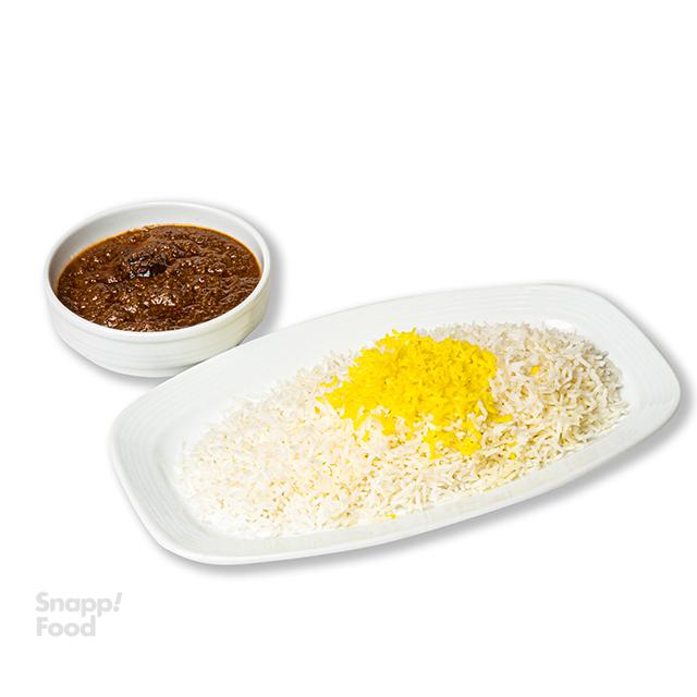 300 گرم خورشت، طعم ملس رو به شیرین، بدون مرغ و گوشت، 350 گرم برنج ایرانی با نثار زعفرانی