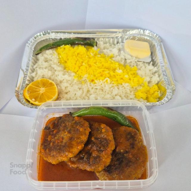 کباب تابه ای گوشت مخلوط 200گرمی، 450 گرم برنج ایرانی ودودی، دورچین: گوجه تابه ای، فلفل کبابی، لیمویانارنج، ته دیگ