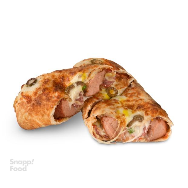 1 عدد هات داگ 90 درصد، خمیر پیتزا، سس مارینارا، پپرونی، پنیر پیتزا، زیتون