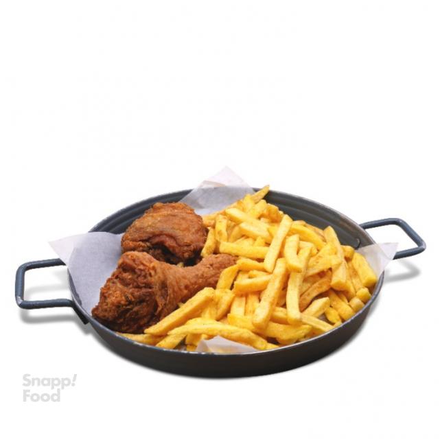 دو تكه مرغ سوخاری، سيب زميني سرخ كرده، سالاد كلم، نان