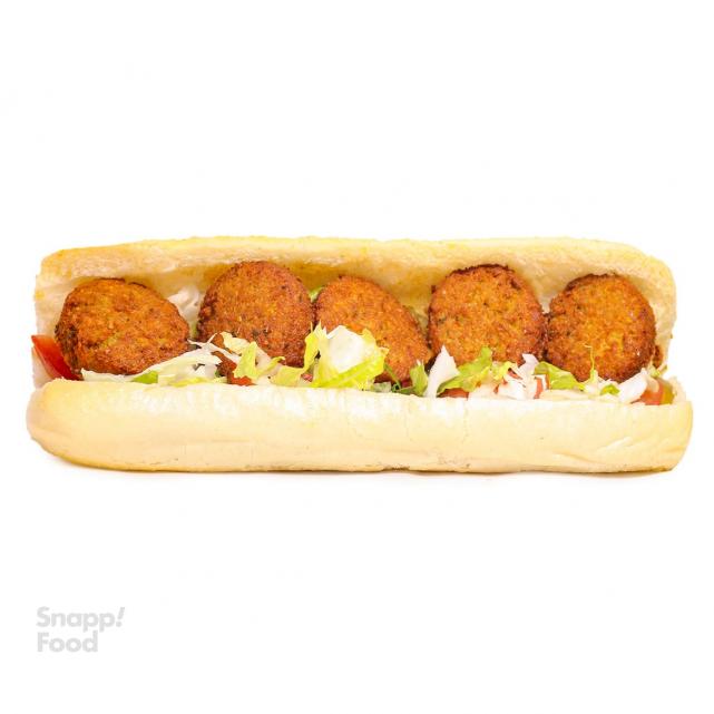 5 قرص فلافل، کاهو، کلم، خیارشور، گوجه فرنگی، پیاز جعفری، نان باگت