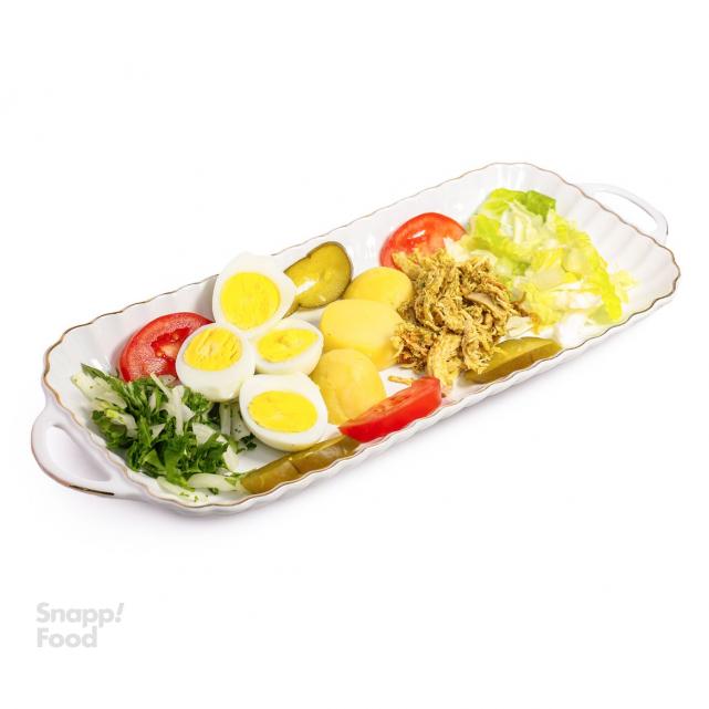 2 عدد تخم مرغ آب پز، یک عدد سیب زمینی آب پز، بدون نان